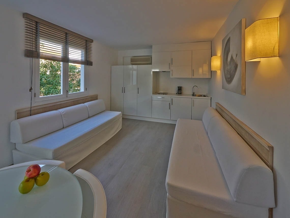 Los apartamentos están situados en una zona tranquila frente al edificio principal del hotel. Nuestros renovados y confortables apartamentos disponen de 39 m2, son para 3 o 4 personas y se componen de un dormitorio, un salón con cocina y un baño.